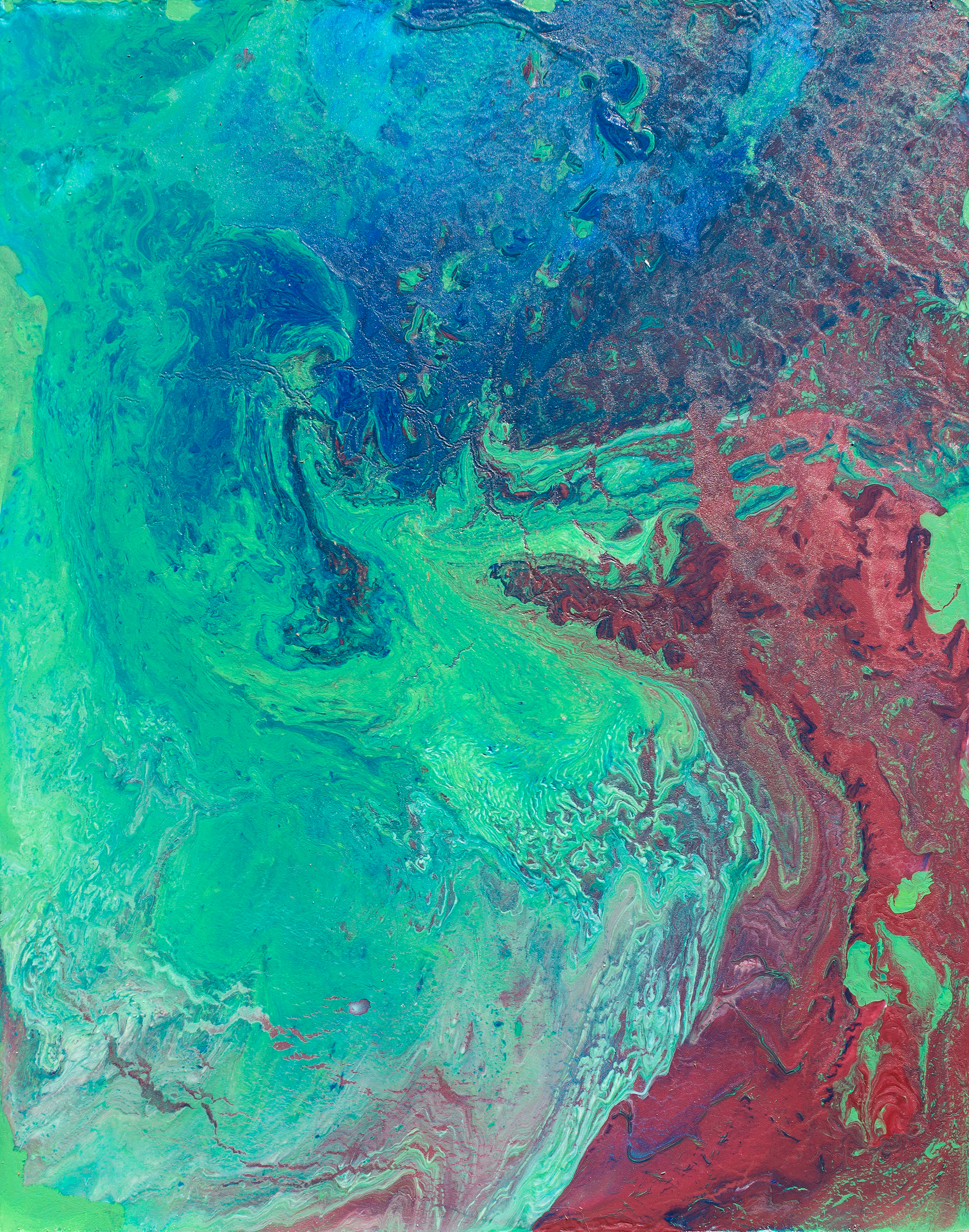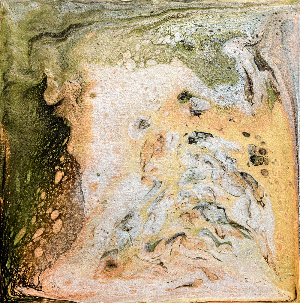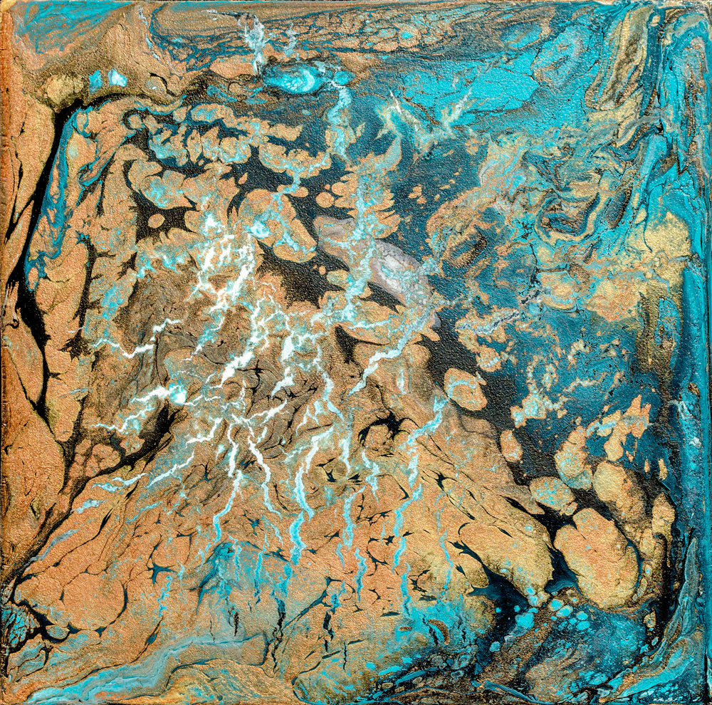 I like to make paintings using several different “paint pouring” techniques: several colors of paint go into a cup, then you add something like rubbing alcohol or silicone oil and pour it on the canvas, producing fascinating effects as the paint dries.